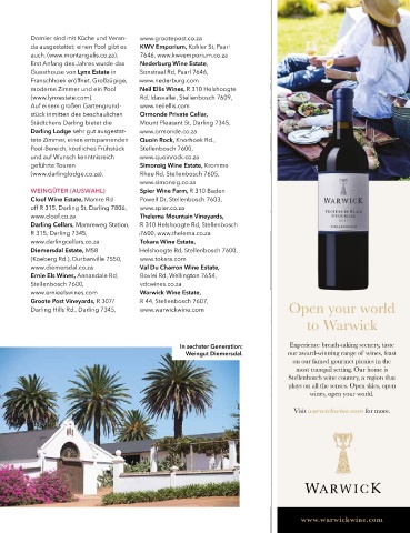 im kapholländischen Stil eine Se- (www.quoinrock.co.za). Darling Hills Rd., Darling 7345, www.warwickwine.com Open your world